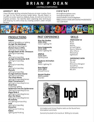 Over two decades in feature animation have exposed Brian P Dean to a rich variety of studios, workflows, and approaches to creating animated content. His journey began at Blue Sky Studios on "Robots," where he took his first steps into lighting as a technical assistant. By his second film, "Ice Age: The Meltdown," he had progressed so rapidly that as a junior lighter, he was entrusted with lighting entire sequences independently - a responsibility rarely given to someone at that level.